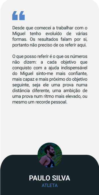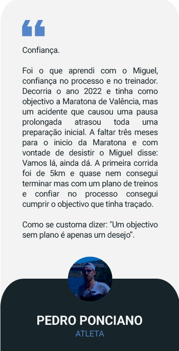 No início irás receber um plano de 8 semanas que apresenta como objetivo maior permitir fazer uma transição dos teus hábitos antigos e/ou preparar-te para os teus primeiros 10km. Esses 10km irão servir também como avaliação para definir zonas de treino com maior exatidão. Depois do período inicial, iremos começar a trabalhar por blocos, como forma de melhorar a tua condição física.